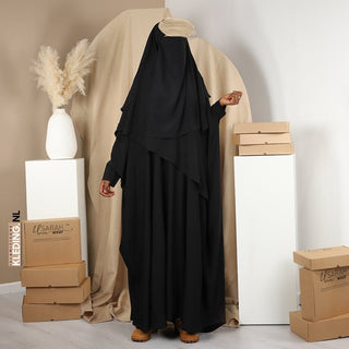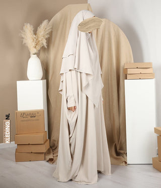 Je hebt Khimar’s tot aan je heup of tot aan je knie en zelfs tot aan je enkel. Je hebt de vlinder of batwing versie of juist eentje met wat strakkere mouwen. Khumor (meervoud van Khimar) heb je in alle kleuren die je kan bedenken en die je zou willen. Een Khimar is een van de meest bedekkende kledingstukken en het makkelijkst aan te doen, het wijst meestal voor zich. Met een band die je achter je hoofd om bindt is alles eigenlijk al gedaan en zal de khimar vallen zoals hij hoort.In 2018 hebben wij onder nieuwste khimar modellen online aangeboden. Dit is de khimar met coll. De traditionele khimar spant tussen het hoofd en de schouders wat zeer ongemakkelijk is. Met name in de winter als je veel kleding draagt. De Khimar met Coll, de naam zegt het al, heeft een ingebouwde coll. Dit is een ruime stof rondom het nek waardoor je khimar niet meer trekt tussen het hoofd en de schouders. Dit model geeft zeer veel bewegingsvrijheid zonder bang hoeven te zijn dat je khimar van je hoofd afglijdt doordat de stof bij de schouders trekt.