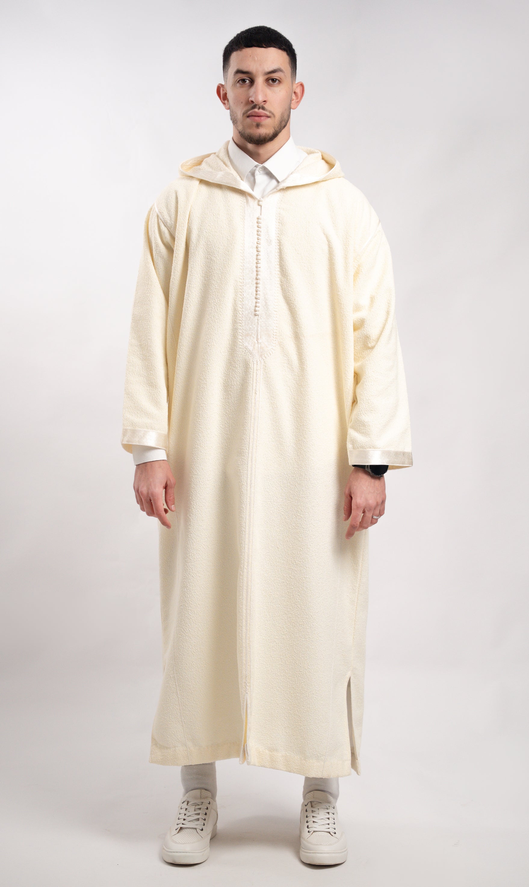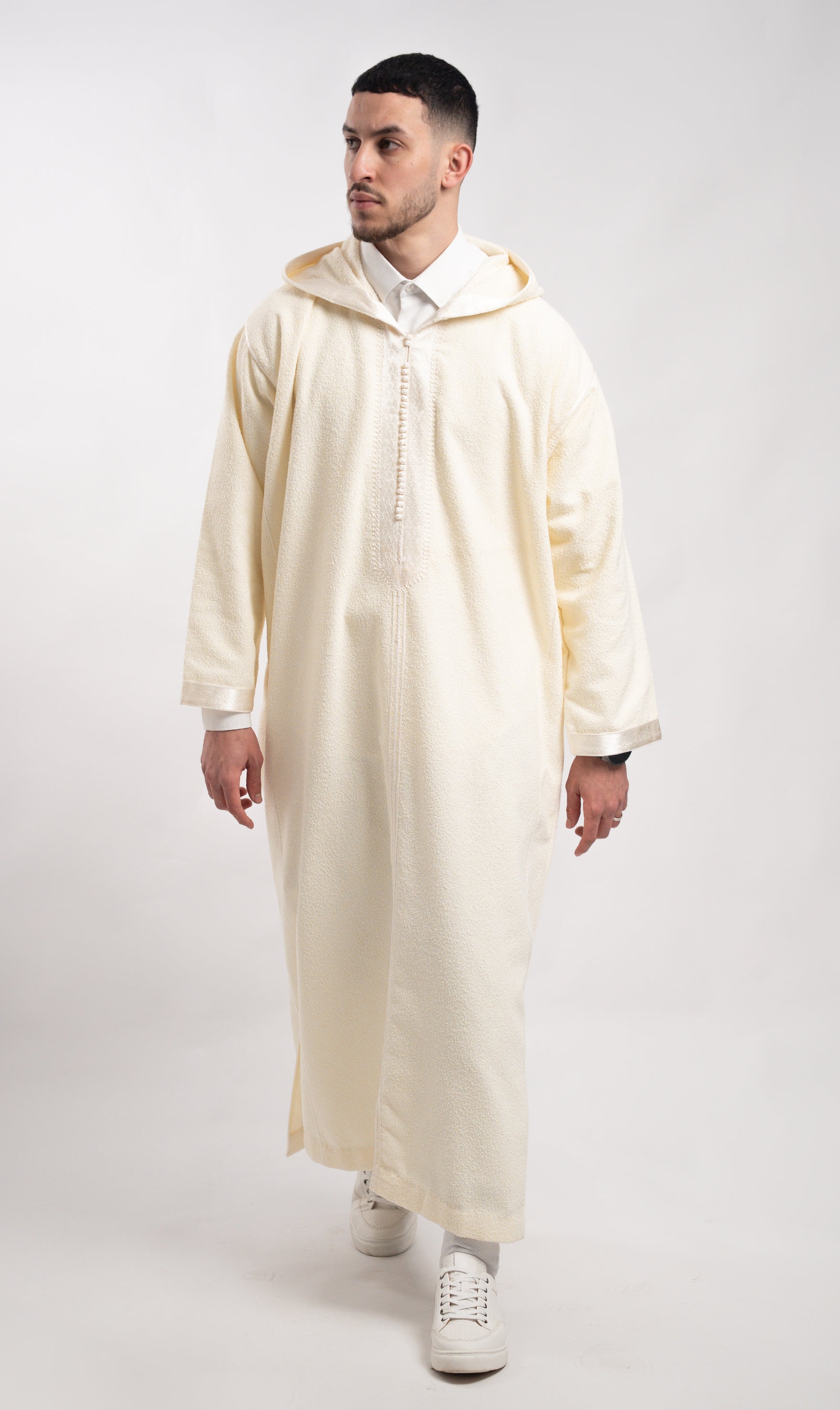 Traditionele Marokkaanse wollen jellaba met cappuchion. Deze exclusieve Bohemien heeft een dikke zachte hoge plooien stof. De stof is een mix van Wol als syntische wol. Deze jellaba wordt over een witte thoub, overhemd of coll-trui gedragen waarbij deze jelleba iets korter bij de armen als in de lengte dient te vallen. De jellaba heeft geen zakken, maar zowel links als rechts openingen naar de broek toe.